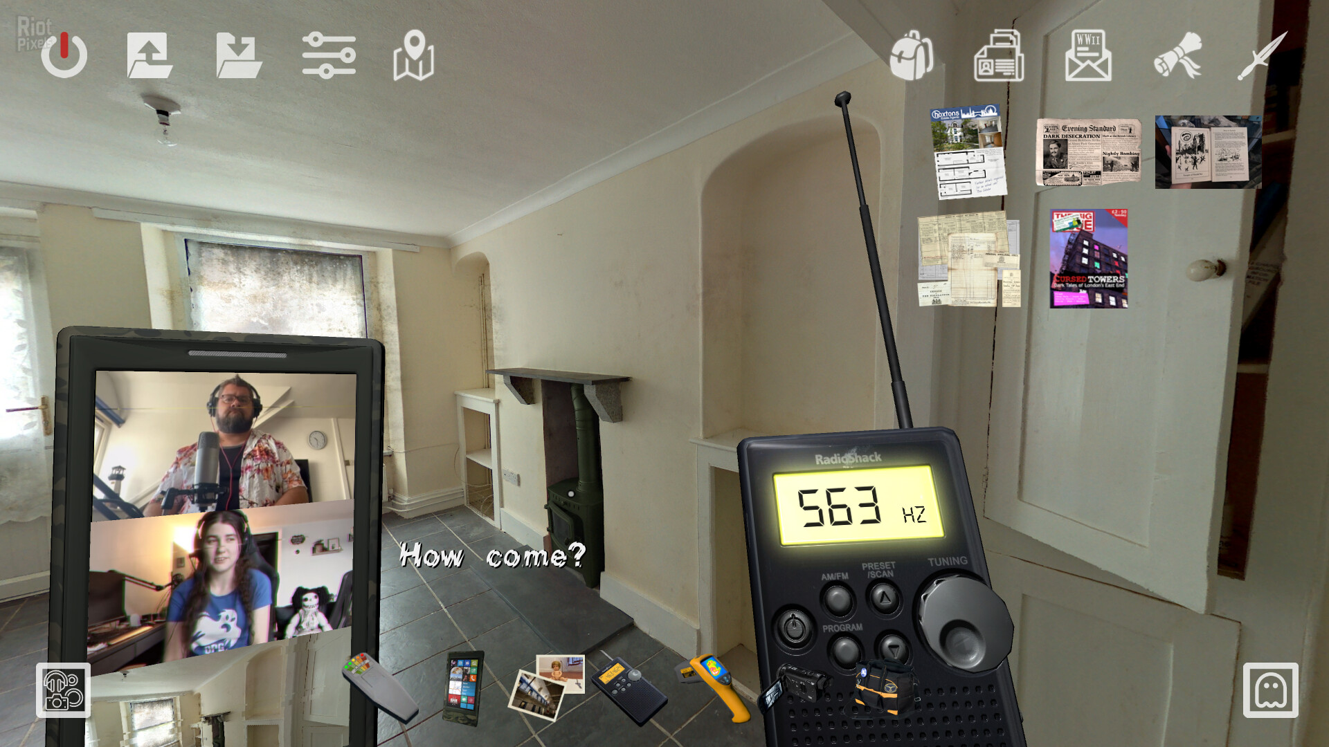 - Interact with ghost-hunting gadgets to investigate.