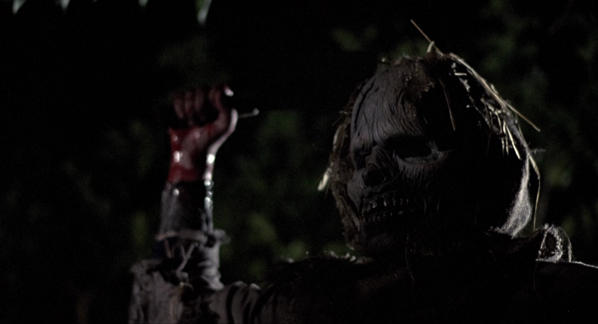 Scarecrows (1988), directed by William Wesley, Shout! Factory remaster, encoded in 10 bit HEVC with AAC sound, including 5.1 remaster, two commentary tracks, and English subtitles.