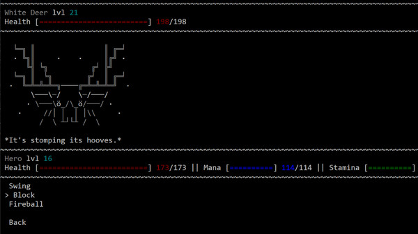 Feels is an ASCII and Text-Based RPG where every one of your decisions can influence the world in which you evolve. It is filled with organic story lines, diverse endings and strategic turn-based combat.