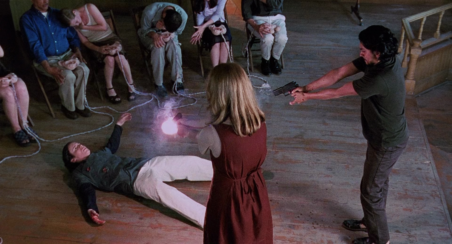 Allegra Geller is a game designer who's doing a playable demo of her latest virtual reality game, eXistenZ, in an old church. VR games, running on organic computers, are opposed by a terrorist faction called Realists, and one of them has infiltrated the demonstration, shooting Geller in the shoulder before being killed by security, and she goes on the run, helped by publicist Ted Pikul. Geller's game pod may have been damaged, and as it contains the only copy of the game, she insists Pikul help her test it, which involves installing a bio-port in his spine by a black market salesman, but his motives are not what they seem, and they discover they're being hunted by several rival factions.