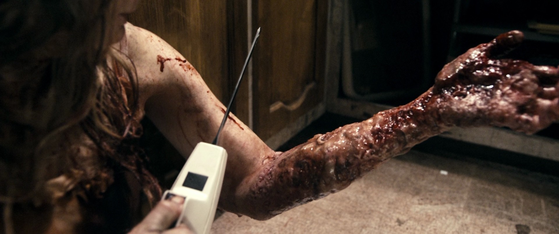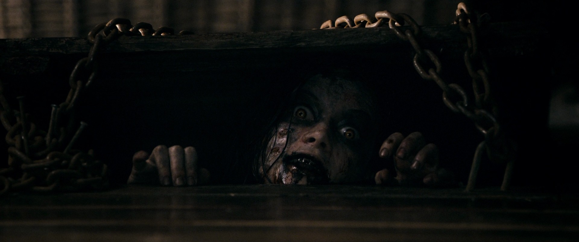 A demon-possessed young woman is tied to a column in the cellar of a cabin, set on fire and shot in the head by her own father. Some time later, a group of people arrive to the cabin, where they plan to stay while heroin addict Mia goes cold turkey. As Mia starts going through withdrawal, her brother David explores the cellar, which is full of animal corpses, and finds a shotgun and a book wrapped in barbed wire. Long-haired nerd with glasses Eric, who likes to read, like a nerd, reads an incantation from the book, awakening something in the forest, and Mia sees a demonic doppelganger of herself, which makes her panic, steal Eric's car and try to escape, but she crashes into a pond, runs off into the woods, and an angry raping tree angrily rapes her, allowing her doppelganger to possess her. When she returns to the cabin, the madness starts to spread, as one by one, the friends succumb to possession, inevitably leading to grotesque mutilation of themselves and others, and according to the book, the "Taker of Souls" must claim five souls to release the "Abomination", which is handy, because they're exactly five people. Imagine the trouble they'd have saved themselves if one of them had gotten a stomach bug and couldn't go. Anyway, lots of gore ensues, and Mia must finally face her doppelganger under a literal rain of blood.