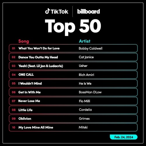 Preview: https://www.billboard.com/charts/tiktok-billboard-top-50/2024-03-02/