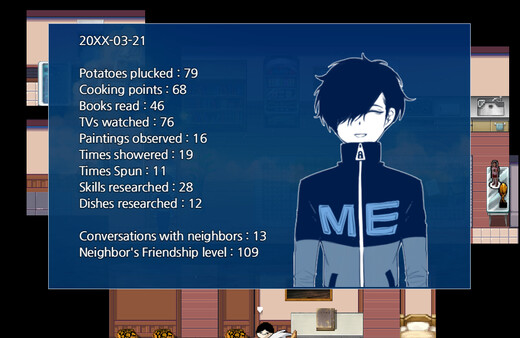 Potato Survival is a short story game about a character who lives alone on the open sea. Collect potatoes and try to survive for 21 days with the knowledge you gain daily. Unlock new skills to create a more meaningful day to day life!