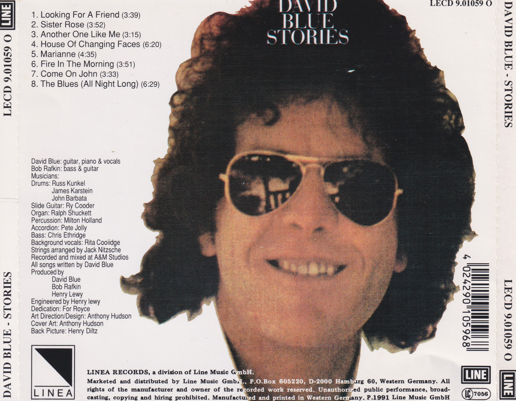 With his fourth album, Stories, David Blue joined Asylum Records, the label headed by David Geffen that had been set up to shelter singer/songwriters like Jackson Browne. For Blue, it was another welcoming home after stints at similarly artist-friendly Elektra and Reprise, and Stories was a continuation of his explorations of the personal relationships of sensitive people. The opening song was called "Looking for a Friend," and that was a good introduction to an album that was about the ups and downs of friendship and the loneliness that sets in when friends are not around.