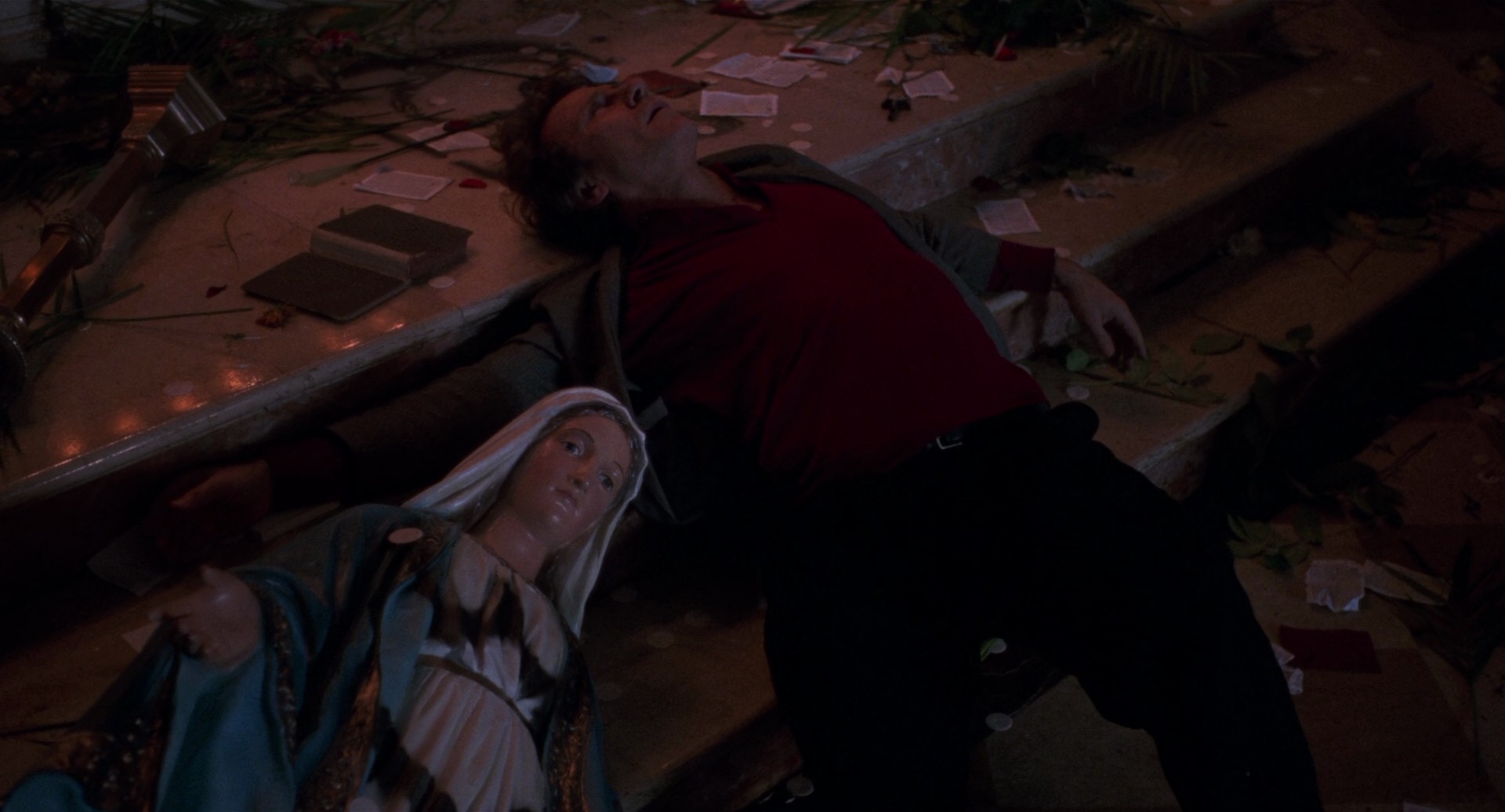 A NYPD lieutenant drops off his kids at Catholic school, then has a bump of cocaine and drives to a crime scene, where he steals a bag of drugs, which he later gives to a drug dealer who promises to pay him for it soon, all the while smoking crack. At night, he gets drunk and has a threesome with two prostitutes, then smokes heroin with a woman at another apartment. At the same time, a nun is raped in a church by two young criminals. As he continues stealing drugs and has bad luck at gambling, he gets involved in the investigation of the rape, and learns the nun was penetrated with a crucifix. He goes into a downward spiral of religious guilt, self-destructive behavior and gambling with money he doesn't have, as it all builds to a climax that might be redemptive or just plain nihilistic.