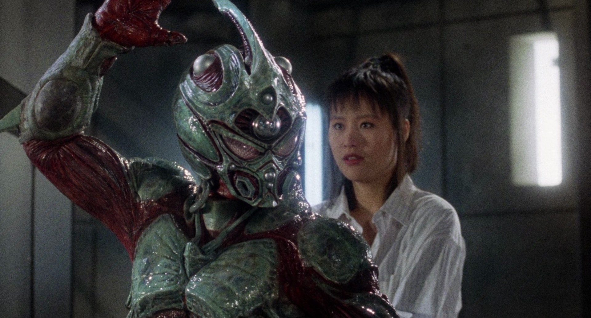 Note : Here's a nice little piece of 90s trash for you, an American tokusatsu film based on a manga, of all things, directed by long-time Brian Yuzna SFX collaborator Screaming Mad George (and his SFX buddy Steve Wang), it sports some rad (but still faintly ridiculous) practical effects, a fair big of gore, and kind of a lackluster story that seems to be right out of shonen manga. The decent enough cast is headed up by total unknown Jack Armstrong, Mark Hamill, sporting a mustache and a sleazy come-hither demeanor, and Vivian Wu, with appearances by Yuzna regulars David Gale and Jeffrey Combs, as well as horror icons Michael Berryman and Linnea Quigley. It's ridiculous, but it's pretty fun.