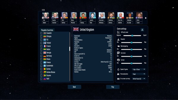 The new 5th edition of the hyperrealistic global simulator game where you play as the Head of State or as the opposition or the president of a large multinational company, with a completely redesigned interface, a new ultra-detailed map, complete control of companies and new scenarios for 2024.