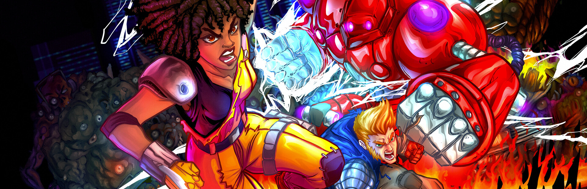 Vengeance Hunters is an adrenaline fueled Neo-Geo hardware developed beat’em’up that lets you and a friend in local co-op fight mutants, zombies, punks, gangsters, lab techs with bombs (you read that correctly), suited mystery men, cyborgs and more across multiple stages, sublevels and secret areas.