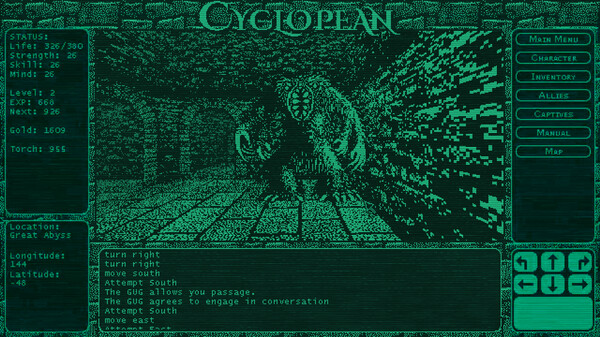 Cyclopean: The Great Abyss is a small scale, monochromatic CRPG in a retro style, that takes place in the underworld of H.P. Lovecraft's Dreamlands.