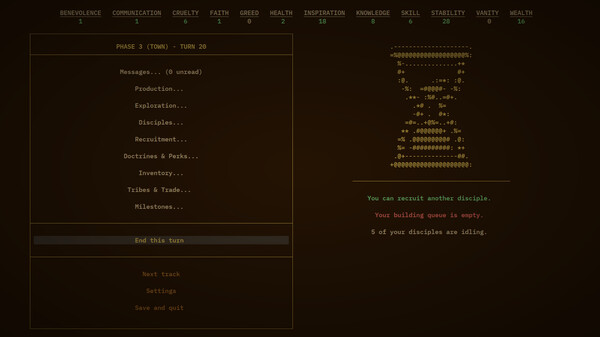 Text-based 4X with a focus on turf war, events and resource management. Roots of Harmony is a strategy game where you have to lead your colony to different stages of development, while facing various threats and managing your doctrines and disciples. 100% gameplay, ASCII graphics only!