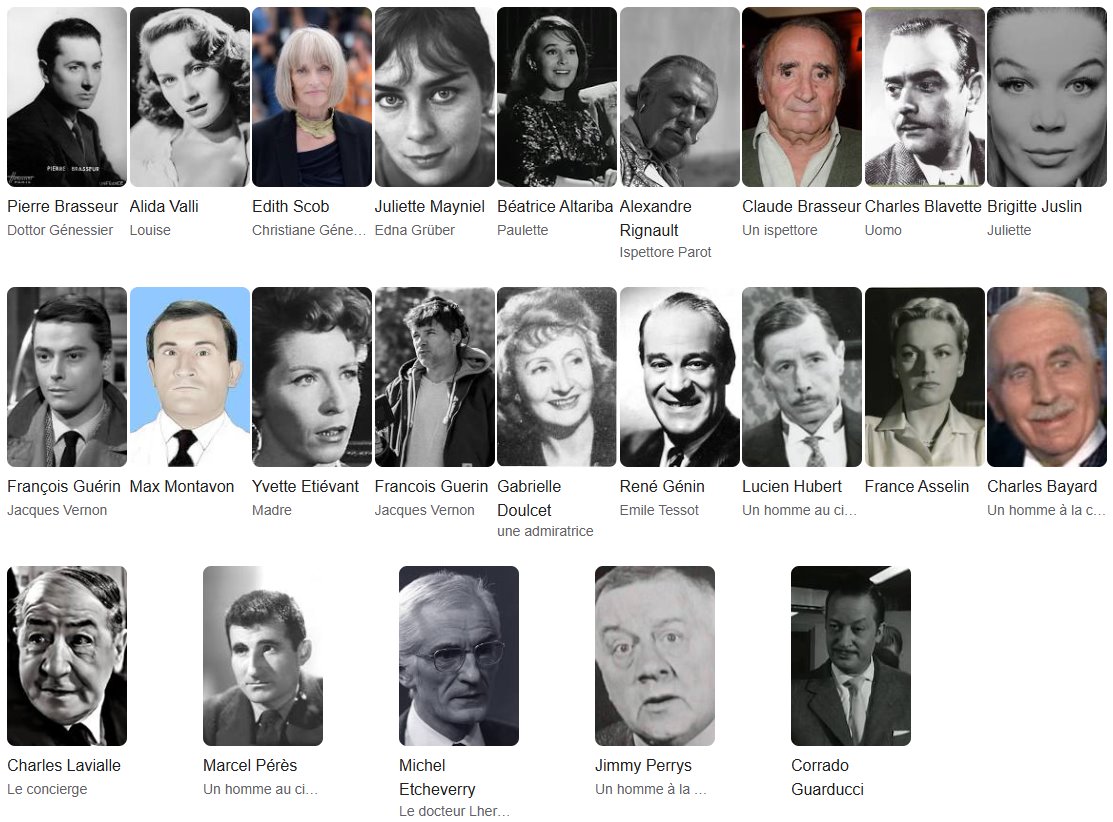 Alida Valli: La presenza dell'attrice italiana Alida Valli (già star internazionale grazie a film come "Il terzo uomo" e "Senso") nel ruolo complesso di Louise aggiunse prestigio alla produzione. Il suo personaggio è cruciale: non una semplice assistente, ma una donna legata a Génessier da un debito di riconoscenza (le salvò il volto) e forse da una dipendenza psicologica.