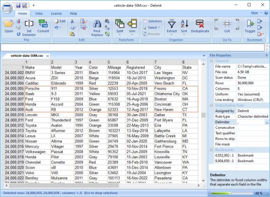 Features Quickly open any delimited data file and automatically detect the delimiter. Or set the delimiter of an opened file manually, can be any character, string/text or fixed column widths. Convert files from any delimiter to any delimiter like CSV to TAB, or change line endings from CRLF to LF and vice versa. Find and replace data or empty cells throughout the entire file or within specific columns and/or rows. Split-up any delimited data file into file parts of equal size or split-up based on column values. Join multiple delimited files into one resulting file or join rows from two files on matching column values. Quickly select which columns to extract and in which order. Extract data from any delimited file by specifying a filter. Extract every Nth row or a random number of rows. Sort any delimited data file based on cell content or shuffle/randomize all rows. Deduplicate rows based on any set of columns. Jump to any cell or jump to any corner cell of the file. Bookmark any cell for quick subsequent access. Open large delimited data files; many GBs in size! Open data files up to 2 billion rows and 2 million columns large! Work with character delimited, string delimited, fixed column width or just plain text files. Quickly see all your bookmarks, double-click to jump to any of them or click to rename. Keep track of long running operations. Scroll vertically or horizontally to any part of the file or split the view into multiple panes. Keep track of the current selection. Freeze the 1st row of any file. Open multiple files, move them to tab groups and quickly switch between the files. Configure built-in and custom file delimitation rules for automatic parsing of files.