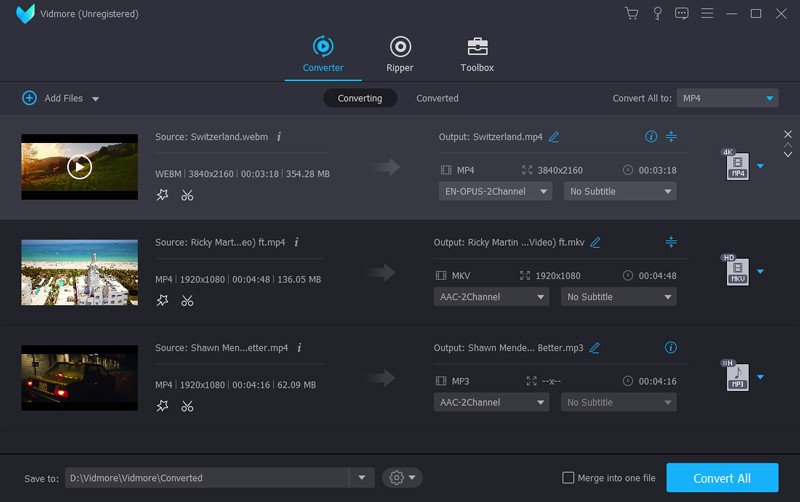 Vidmore Video Converter enables you to convert all common media formats, including AVI, MKV, MOV, MP4, WMV, WebM, M4V and FLV. You can easily change the format of your video file