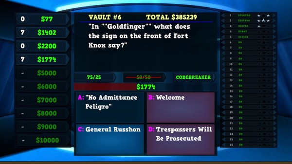Welcome to the Trivia Vault contestant! Play as a contestant in a gameshow called Trivia Vault Movie Trivia and bring your thinking hat. Answer movie trivia questions as quickly as you can, the faster you answer the higher the cash value.