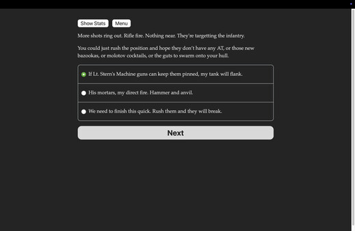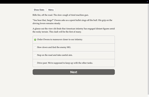 North Africa, 1942. Command a U.S. tank. Lead your men against the Axis powers. Learn the hard lessons of war. The odds are against you. A text-based historical novel, 900,000 words and hundreds of choices, without graphics or sound effects.