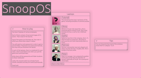 Sneaky IT Support is a puzzle simulation game where you find naughty secrets in employee computers. Crack their passwords, snoop through their files, find their nudes and uncover their stories!