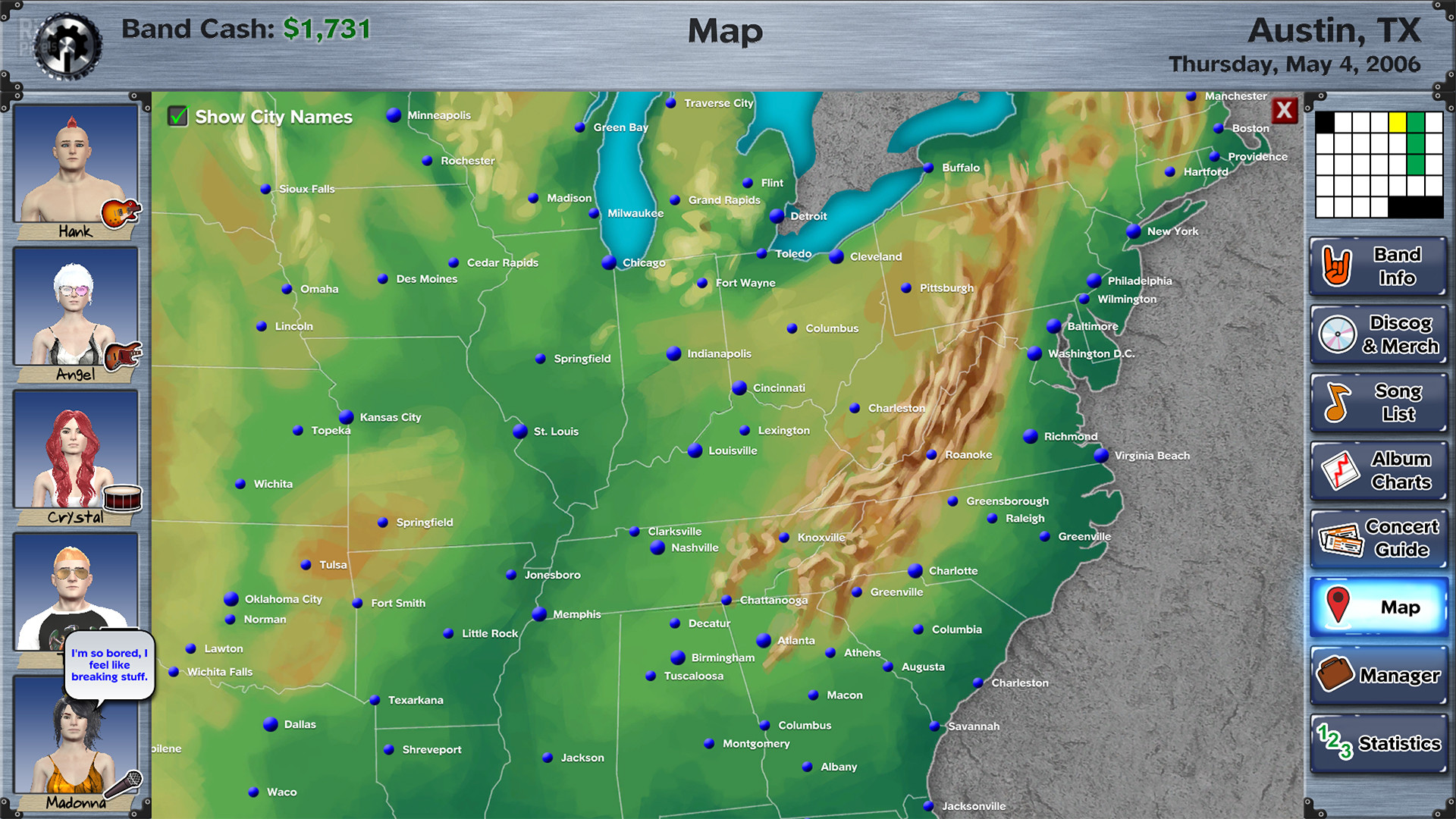 Choose your starting city in the continental United States, and conquer as many cities as you can while on tour. You can even buy a home in each city, to make visits more convenient than staying in a hotel or motel. Of course, trashing hotels is half the fun of touring, but you’ll have to pick up the tab.