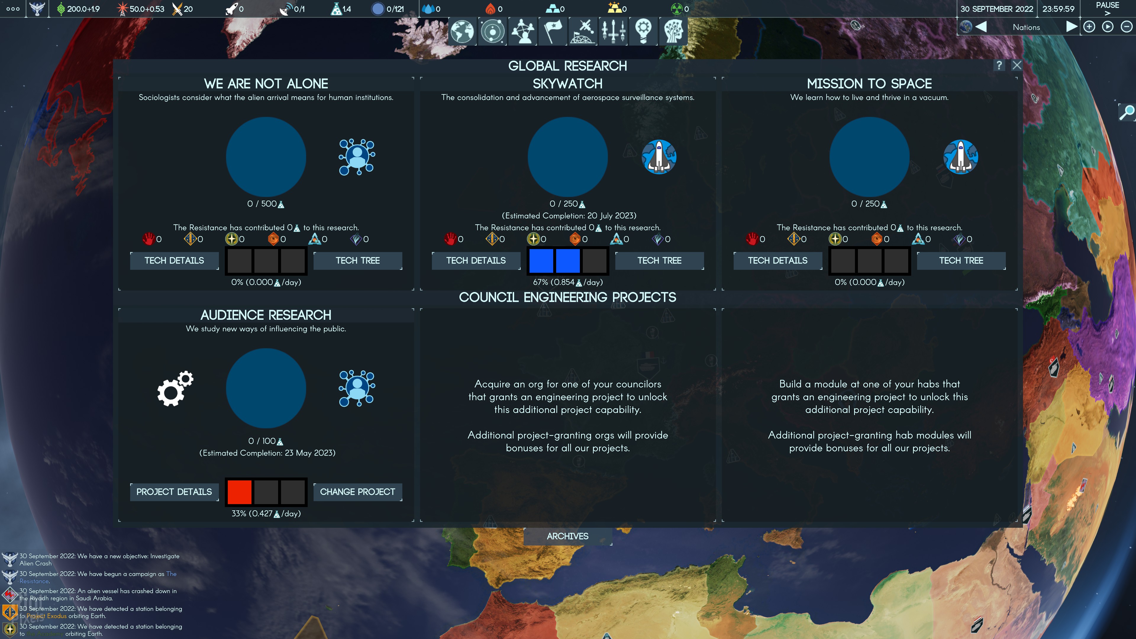 - INVESTIGATE THE ALIEN THREAT - A distant anomaly, a mysterious crash site, and a spike in reported disappearances. Could this truly be humanity's first contact with extraterrestrial lifeforms As your field agents investigate sightings and your scientists race to explore new fields of research, you will slowly learn the truth behind the alien arrival. From early sightings and UFO crash sites to rampaging alien megafauna and robotic armies, it will rapidly become clear that the other six human factions are not your sole competition. Throughout the game, illustrated events will present you with difficult choices as you investigate growing alien activity on Earth. Uncover the mystery of the aliens' origins and motives – unless, of course, you are Humanity First, and all that matters to you is extermination. Terra Invicta has a global research system that creates opportunities for both competition and cooperation. Shared scientific advancement unlocks private engineering projects. Factions can choose to focus on private projects, at the cost of weakening Earth as a whole and ceding influence over global research direction to other factions with different priorities. Left unchecked, factions like the Servants or the Initiative may steer the world's efforts toward developing methods of social control, rather than propulsion or weapon systems.