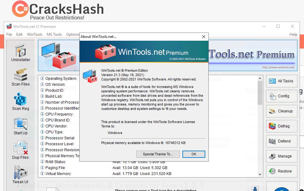 .WinTools.net Professional contains tools: Clean Uninstaller, Scan Files, Scan Shortcuts, Scan Registry, Startup Manager, Tweak UI, Net Tweaker, The Privacy, Invisible Man, File Shredder…