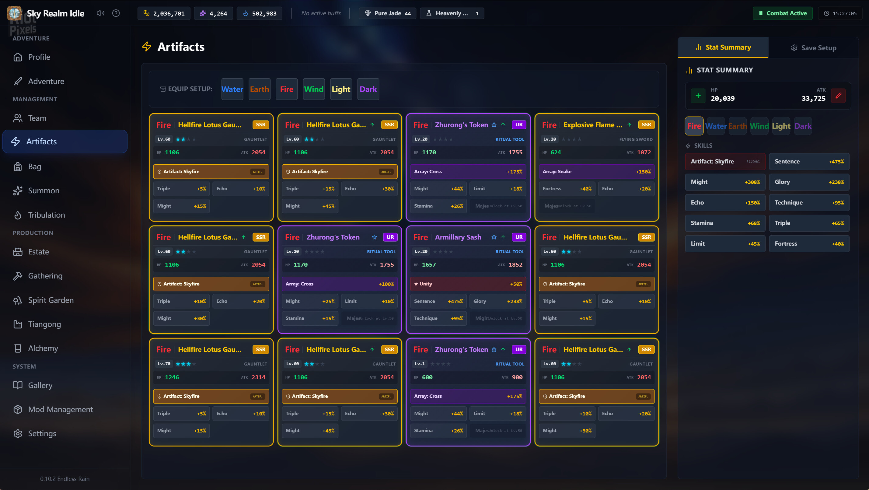 - Core Gameplay: The Spirit Array - Say goodbye to mindless power creep. Your strength comes from the "Spirit Array" (Grid) System. Collect and upgrade hundreds of unique artifacts to fill your 12 grid slots. Each artifact carries unique skills (e.g., Might, Critical, Enmity). Building the perfect grid to counter your enemy's element is the key to victory.