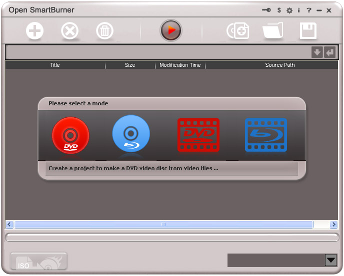 Open SmartBurner is a powerful DVD/Blu-ray burn application newly developed by OpenCloner Inc. In addition to video files, it can also burn data files (.doc, .txt, .jpg?v=2, .ppt, etc) and audio files to a DVD/Blu-ray disc. Open SmartBurner can also be regarded as a video converter because it will first convert video files with various formats to DVD/Blu-ray movie files and then burn them to a DVD/Blu-ray disc for convenient playback on a standalone player. Besides, you can choose to save the data/video files as an ISO file on the hard disk so that it can be burnt easily anytime. The intuitive interfaces show you various burn modes very clearly, which will make the DVD/Blu-ray burn super easy.